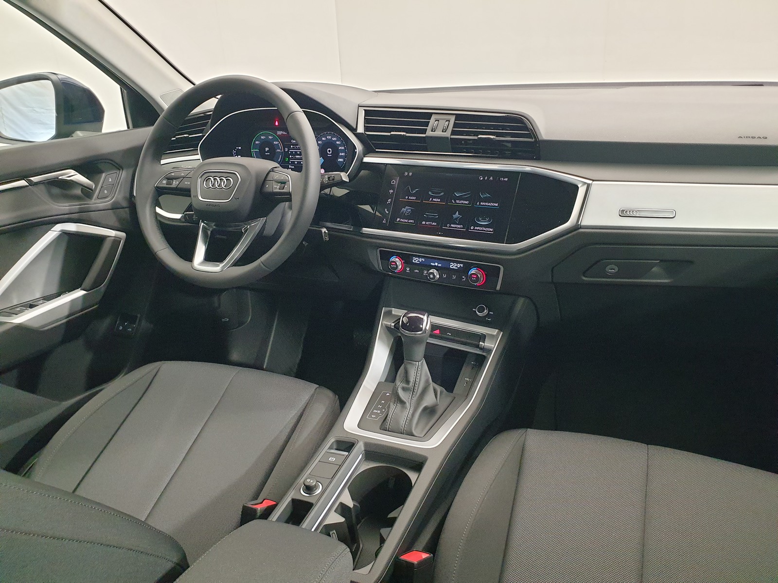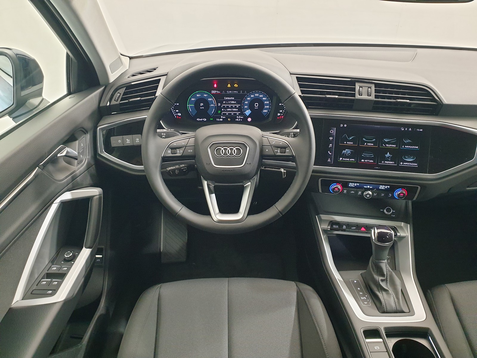 All’interno troviamo un cruscotto che, di serie, prevede già Audi Digital Cockpit e Radio MMI Plus con schermo touch da 8.8″, vivavoce Bluetooth, riconoscimento della scrittura e comando vocale con voce naturale.